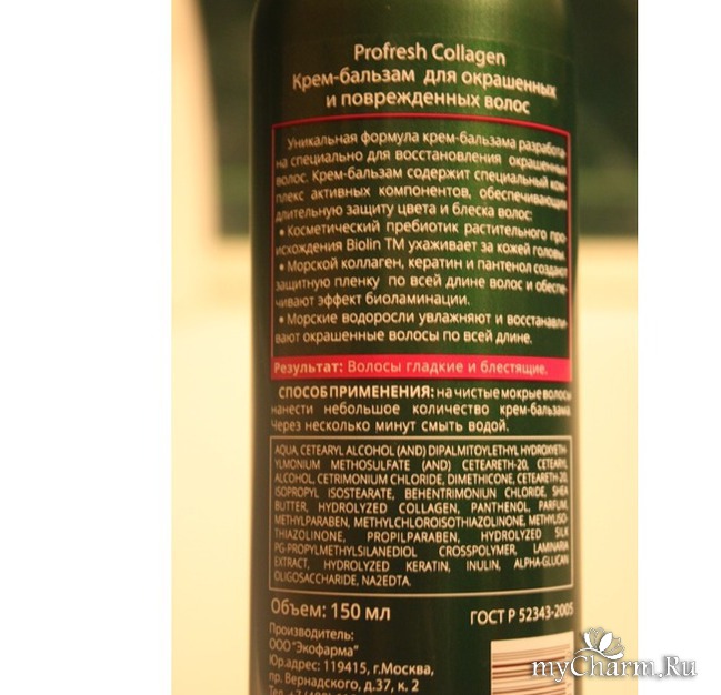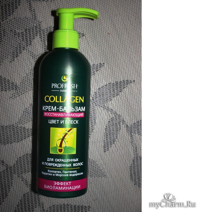 Последним из моих приобретений стал Крем-бальзам Collagen восстанавливающий Цвет и блеск. Средство выпущено ООО «Экофарма» под брендом Profresh hairs. Предназначено для окрашенных и поврежденных волос. Но самое главное, что меня лично подтолкнуло на покупку, это указание на «Эффект биоламинации». Мне знакома процедура ламинирования в салоне и ее результат. Биоламинация же подразумевает сколь угодно частую процедуру по нанесению средства (типа маски) на волосы для оздоровления и придания блеска и упругости. Как вы понимаете, не могла я устоять перед таким заманчивым предложением. Тем более, что флакон 150 мл стоил около 100 рублей. Просто сказка!