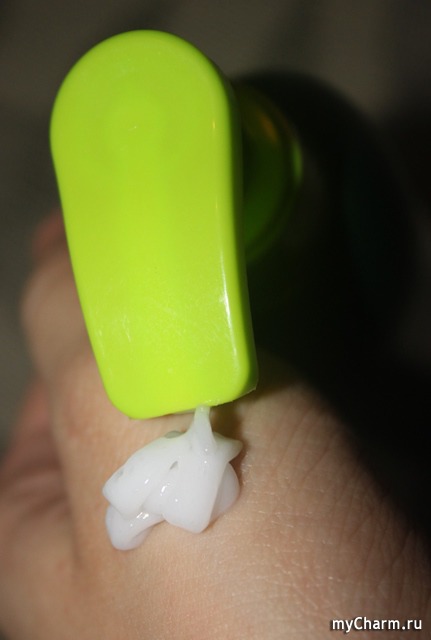 Итак, бальзам нужно наносить на влажные волосы после мытья шампунем. Первый раз у меня оказался комом. Дозатор никак не хотел срабатывать. Как я только не мучила его, но на сотый раз нажиманий - сдалась. Открыла и сняла крышку целиком. Средство оказалось очень густым. Словно это не бальзам, а густая маска. Чтобы извлечь немного мне пришлось перевернуть флакон и даже надавить.