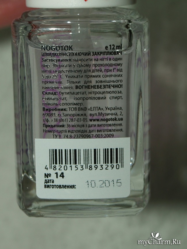Флакон закрепителя объемом 12 мл, это стандарт, но расход у него получается большой, из-за того, что я пользуюсь этим покрытием для каждого своего маникюра. Покрытие, естественно, совершенно прозрачное. Ознакомиться с информацией о средстве можно на обратной стороне пузырька, тут есть и способ применения, и состав средства, и данные о фирме-изготовителе. Также указана и дата изготовления закрепителя.