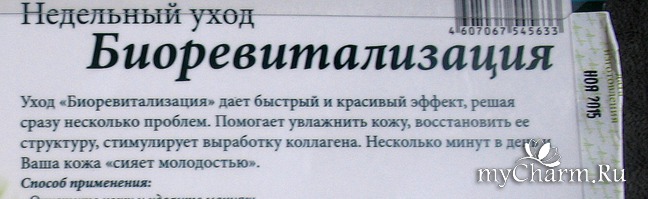 Предназначена для насыщения кожи витаминами и микроэлементами, которые так же перечислены на обратной стороне пакетика.