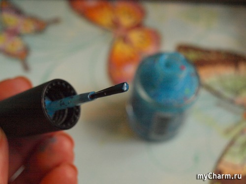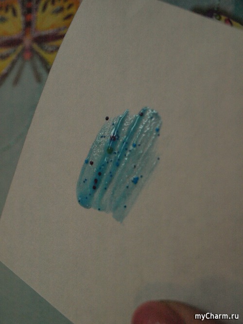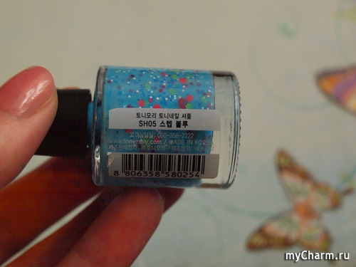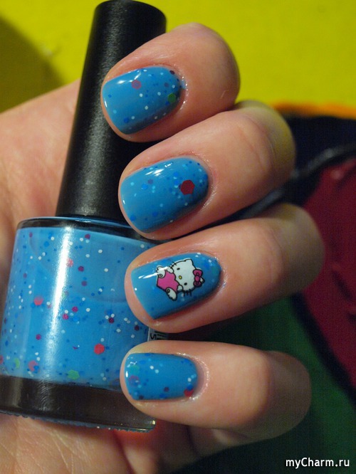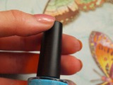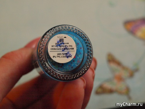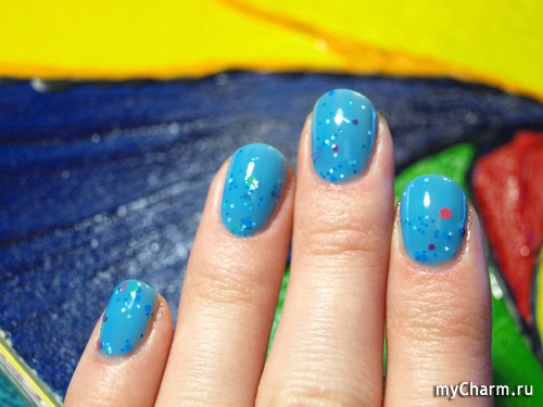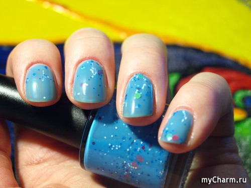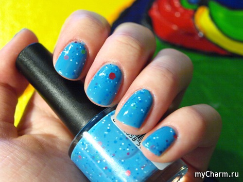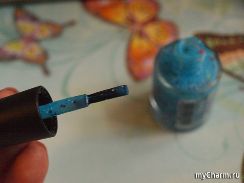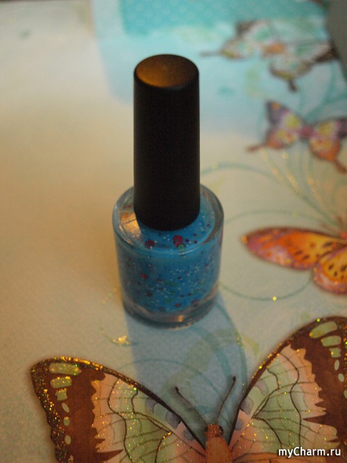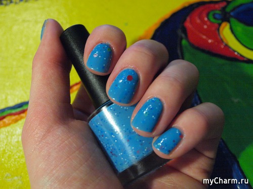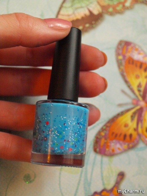 Имеет яркий голубой цвет. Он полупрозрачный. В лаке плавают глиттеренки разного цвета и размеров. Их много, ничего подравнивать не требуется. Крашу как обычным лаком, без всяких распределений по ногтевой пластине.