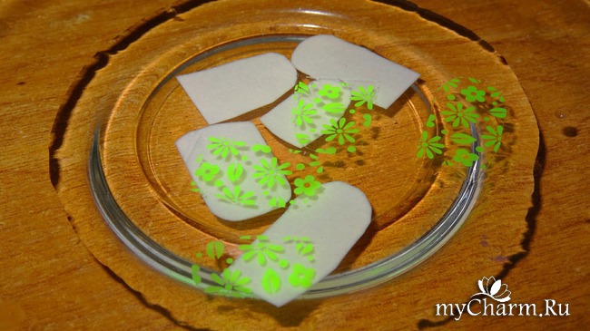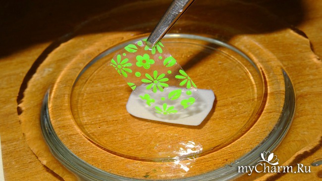 Спустя некоторое время, секунд 20, та часть нашей переводной "татуировки" всплывет на поверхность, а уж если этого не случилось, мы поможем ей пальцем: можно легко сдвинуть верхний слой слайдера, только сделать это нужно в воде, так вы ничем не навредите картинке.