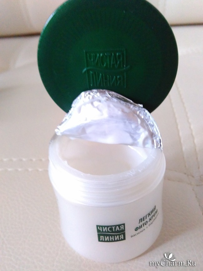 Баночка пластиковая, стандартная для всех кремов «Чистой линии». Она довольно проста в оформлении, но тем не менее приятна. Сама баночка серая, а крышка – зеленая.Открываем крышечку. Баночка еще и фольгой запаяна, значит, о качестве крема можно не беспокоиться. Я решила оставить фольгу и при использовании крема – так он лучше будет храниться.