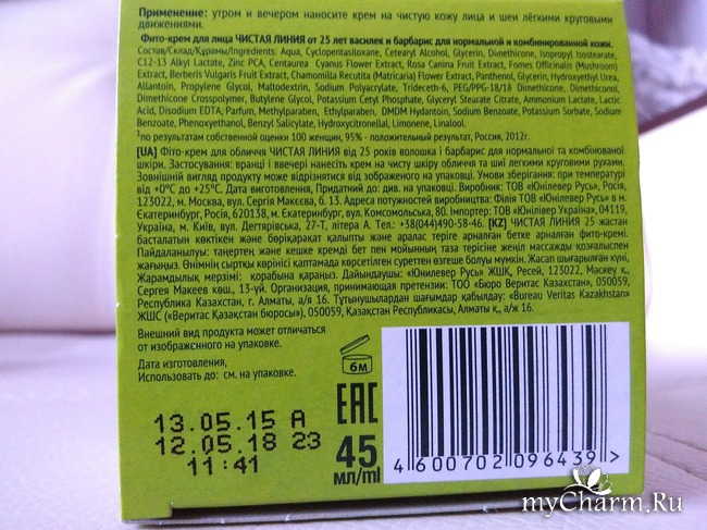Применяю крем примерно месяц. Наношу только на ночь, хоть и написано, что его можно и утром использовать. Утром я применяю солнцезащитный крем, а на этом креме не указано, что в нем есть УФ-фильтры. Хочу сказать, что с каждый применением цвет моего лица улучшается, воспалений стало меньше. Это, конечно, благодаря комплексному подходу к уходу за кожей, но легкий фито-крем для лица «Василек+барбарис»от «Чистой линии» тоже вносит свою долю. Поэтому кремом я больше чем довольна.