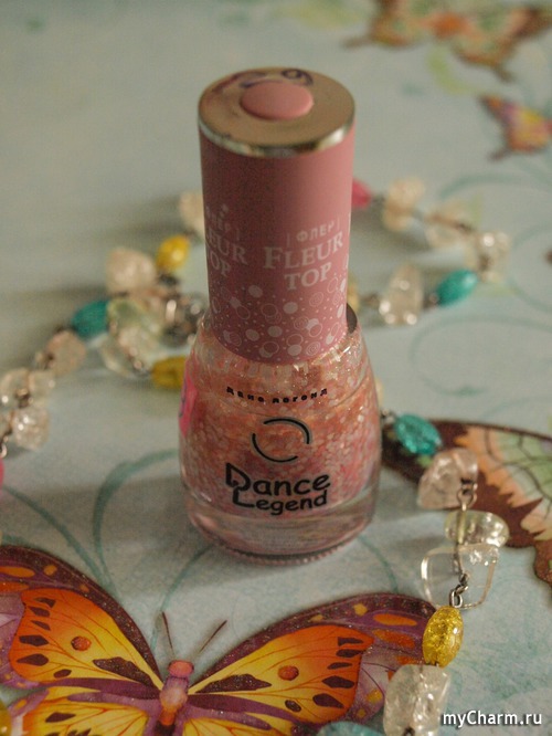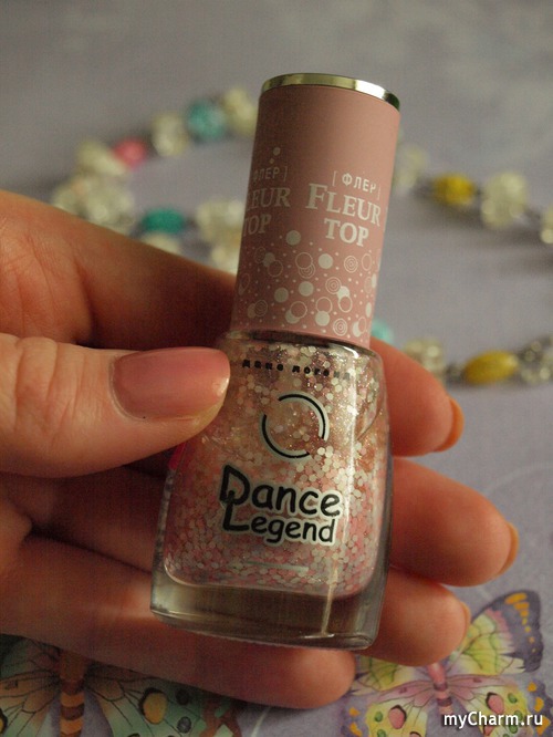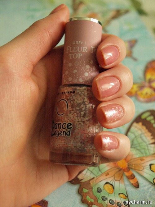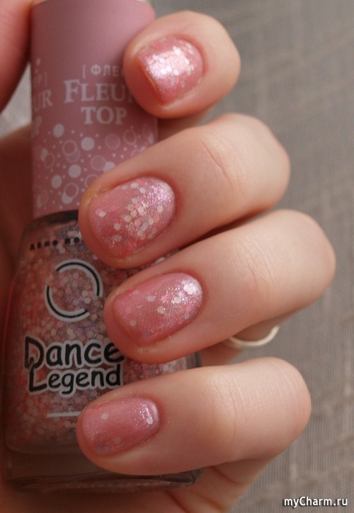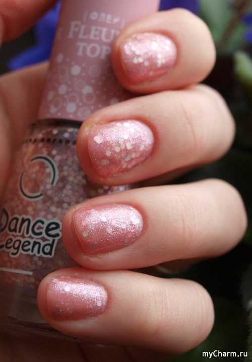 Fleur — это не просто блестки в прозрачной базе, это глиттер разных цветов. Блестяшки нежно-розовые, белые и нежно-голубые (почти белые). Они шестиугольной формы. Также в топе присутствуют малюсенькие частички слюды или голографика! За счет этого смотрится все очень интересно и не банально. К сожалению, частички настолько мелкие, что сложно понять природу их происхождения, затрудняюсь в догадках.