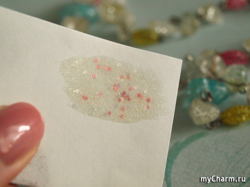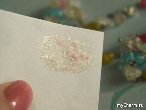 Для примера нанесла топ в один слой на белую бумагу. Очень хорошо видна степень его прозрачности и количества глиттера за раз.
