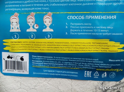 Состав приведен не на русском языке, но многие составляющие понятны и без перевода. Помимо экстракта манго среди ингридиентов указаны еще и экстракты яблока, граната, сливы, персика, арбуза, винограда, клубники. Набор как в лучшем фруктовом салате, а вся польза для кожи лица в одной маске.