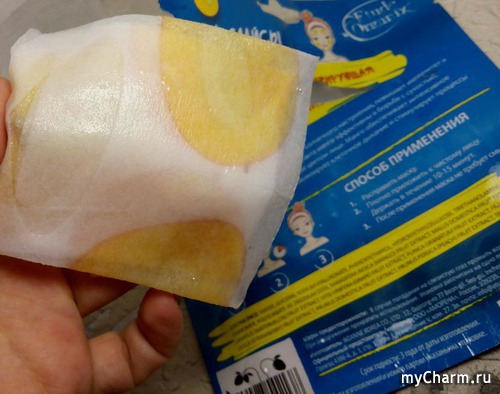 Сверху упаковки предусмотрены небольшие надрезы, благодаря которым она легко открывается. Маска аккуратно сложена и хорошо пропитана, с нее даже немного капает пропитка. Аромат необыкновенный, это устойчивый запах спелого манго, который ощущается в течение всего времени использования.