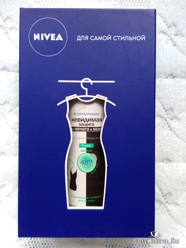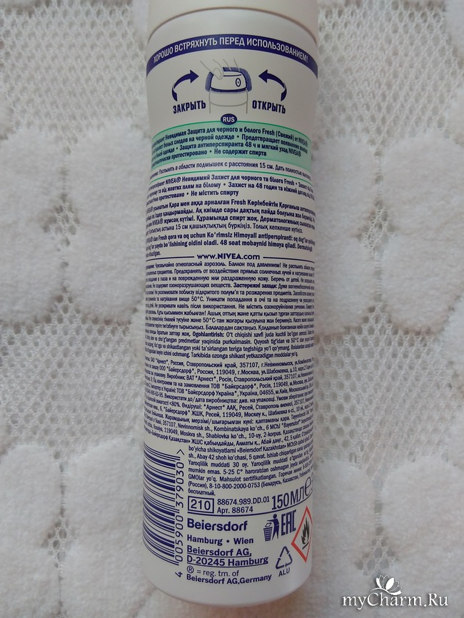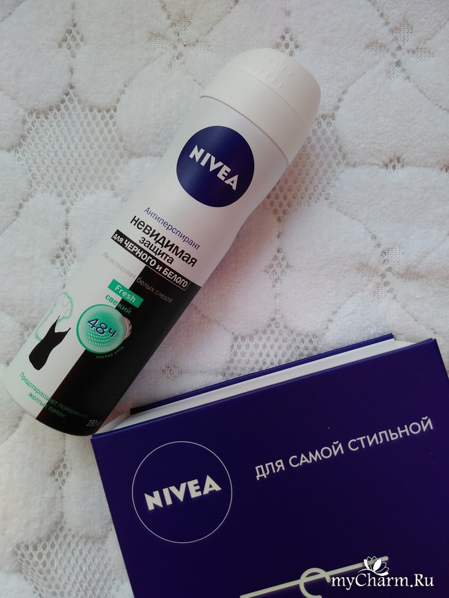 Антиперспирант Nivea «Невидимая защита черного и белого» Fresh отличается очень свежим, но в то же время ненавязчивым ароматом. Он не сбивает ароматы парфюма, что тоже очень важно для многих женщин и девушек. Область подмышек остается сухой и свежей на весь день. Кожа от антиперспиранта нисколько не раздражается, даже наоборот, становится мягкой и ухоженной. В отличие от тех же роликовых дезодорантов, при высыхании антиперспирант в виде спрея не стягивает кожу.