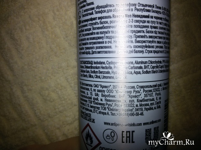 На оборотной стороне баллончика есть небольшая информация об основных преимуществах средства, в том числе об уникальной формуле, не оставляющей следов на одежде, и отсутствии в составе этилового спирта. Правила распыления просты: в течение 2-3 секунд с расстояния 15см от тела. Далее указаны стандартные меры предосторожности (на русском и на украинском языках), телефон горячей линии, состав и адреса изготовителя.