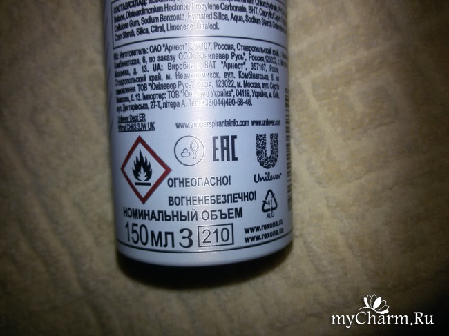 Информация на этикетке дана лаконична, но с повторами: дважды акцент сделан на то, что дезодорант не оставляет следов ни на черном, ни на белом. Плюс ко всему часто встречающееся обещание производителя о том, что средство работает 48 часов.
