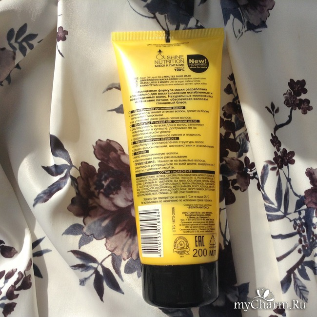 Это не натуральная косметика, а потому там встречается даже парабен. А шелк и аргановое масло находятся примерно в середине. Консистенция маски густая, при нанесении не стекает, распределяется хорошо.
