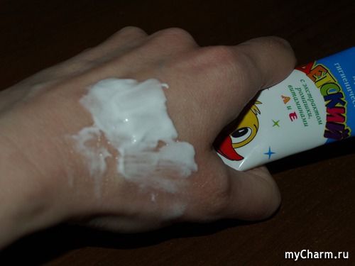 Сам крем густой, белого цвета, при нанесении чувствуется, что крем жирный. На поверхности кожи создается защитный слой и для его впитывания нужно некоторое время. После впитывания кожа хорошо смягчается, становится мягкой, нежной и приятной на ощупь.