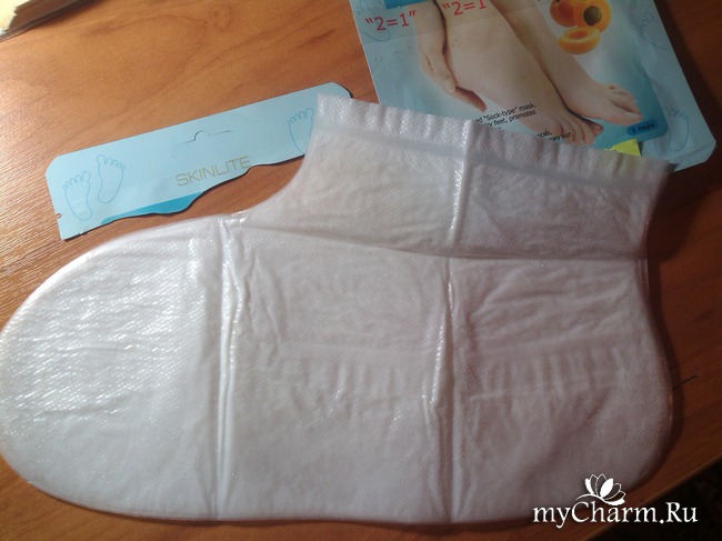 Пользоваться маской легко и приятно. На боковом шве пакетика-саше есть риски, с помощью которых легко надрывается пакет и оттуда достаем пару носочков.