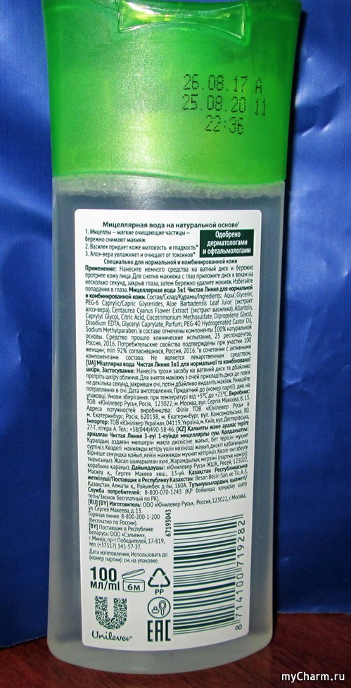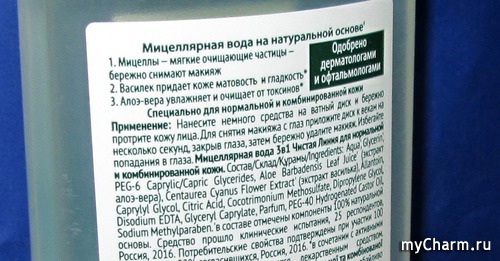 Итак, Мицеллярная вода Чистая линия «3 в 1» Фитотерапия алоэ-вера для нормальной и комбинированной кожи. Я свой тип кожи определяю как жирный. Косметика для комбинированной кожи мне также подходит. А раз «для нормальной и комбинированной кожи», то для меня будет приемлемо, решила я.