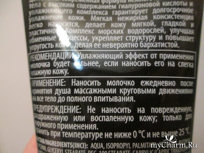 Применение. Я наносила молочко, как и было рекомендовано производителем, регулярно после принятия душа или ванной. Выжимала немного средства на ладонь и круговыми движениями распределяла по телу. Проделывала эту операцию на увлажненную кожу. Так молочко лучше распределялось и быстро впитывалось. Теперь посмотрим на состав этого продукта.