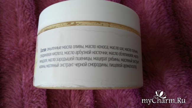 Удивительный натуральный состав, который меня каждый раз радует: это такие полезные для нашей кожи масла оливы и кокоса, ши и пальмы, облепиховое и арбузной косточки, зародышей пшеницы и миндаля, мацерат рябины, масляные экстракты калины и черной смородины, а также сухоцвет и пищевой ароматизатор.