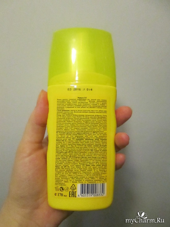 Производителем молочка указано, что заново наносить на кожу ребенка средство стоит после 2-3-ех его купаний в водоеме. Я так делала поначалу и загар, спровоцированный солнечными лучами, все же пробивался сквозь защитную пленку на теле ребенка. Причем, несмотря на довольно высокий СПФ. Потому я стала орошать молочком кожу ребенка после каждой его вылазки из воды. А если он просто играл у воды, редко заходя в воду, обрызгивала его средством через каждые 15 минут. Загар если и был к вечеру, то ровненький, легкий, чуть подрумяненный, а не красный и воспаленный.