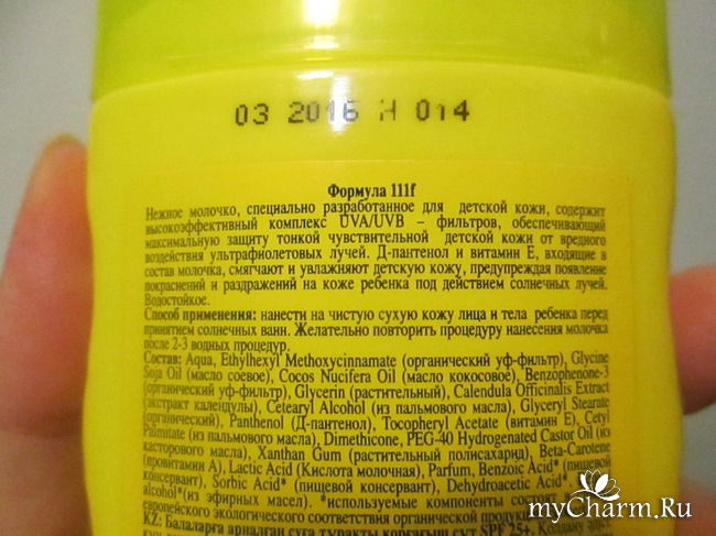 В составе средства - UVA/UVB фильтры (предпочитаю брать фильтры побольше «размером» - для ребенка и нашей местности 25-СПФ будет в самый раз), кокосовое масло, Д-пантенол (помните, что он хорошо заживляет кожу?), витамин Е, экстракт календулы (противовоспалительное).