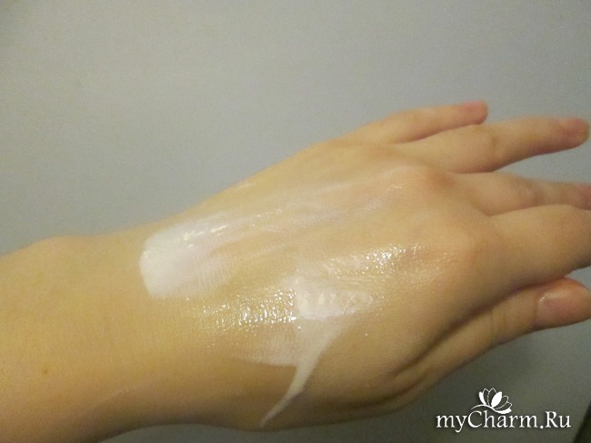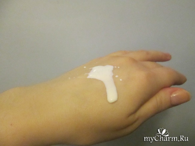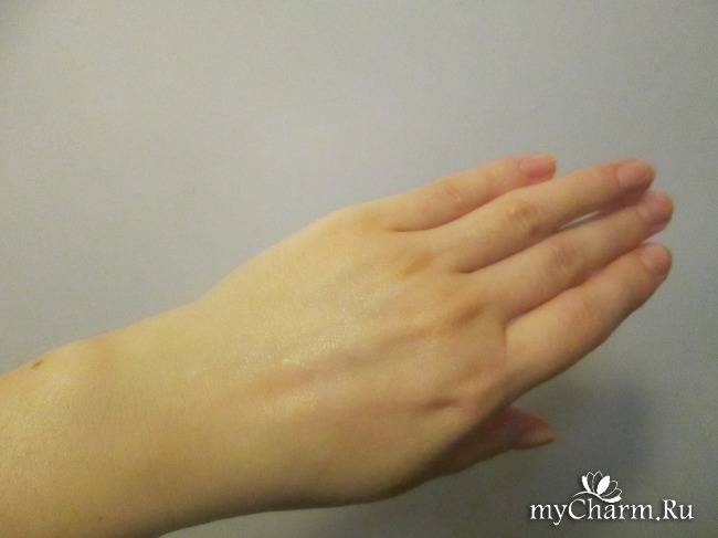 Консистенция у молочка близка к жидкому. На руку брызнула и как видите на фото, молочко быстро расползлось по руке. Даже не успела щелкнуть фото его как следует. После того как брызгаю молочко из пульверизатора на кожу ребенка я его слегка растираю рукой на его теле. Молочко быстро впитывается, не оставляя никакого следа. Запах очень приятный. У ребенка отторжения он не вызывает.