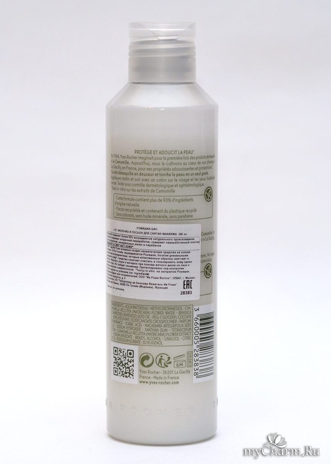 Достаточно солидный флакон в стиле дизайна Yves Rocher белого цвета с откидной крышечкой, украшен нежными ромашками. На флаконе русскоязычная наклейка, все остальное написано на французском языке, я так предполагаю (простите, совершенно его не знаю). Объем 200 мл, срок годности после вскрытия — 6 месяцев. Изготовлено во Франции.