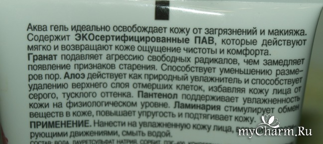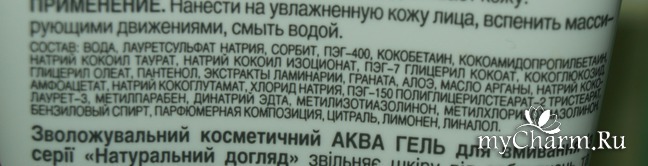 Состав геля указан на тюбике. Можем увидеть, что в состав входит экстракты граната, алое, ламинарии и пантенол. Кроме этих компонентов есть и химические составляющие. Но меня это не смущает, главное, что гель не вызвал на лице никакой отрицательной реакции.