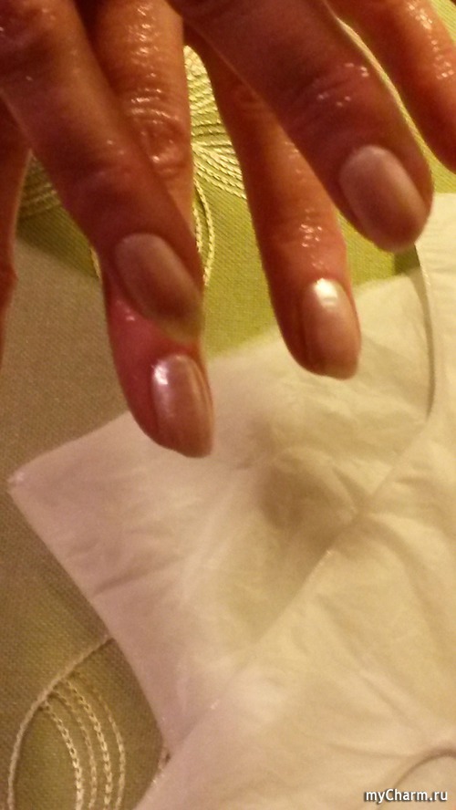 Время истекло, снимаю перчатки, кожа влажная, блестящая от капелек пропитки. Очень нежная и мягкая. Маска подтягивает кожу, разглаживает мелкие морщинки. Ноготки блестят, им тоже понравилась эта вкусняшка. Смывать маску не надо, остатки жидкости похлопывающими движениями легкого массажа вбить в кожу и можно наносить крем.