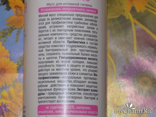 Еще мусс содержит экстракт календулы – природный антисептик. Календула, как мы знаем, способствует уничтожению болезнетворных бактерий и является природным антисептиком. Наконец, у мусса, конечно же, оптимальный уровень pH. Все хорошие средства для интимного ухода должны быть в этом плане сбалансированы. А как иначе? Кстати, данный продукт прошел испытания в ФГБУ «Государственный научный центр дерматовенерологиии косметологии Минздрава РФ». Думаю, это говорит в его пользу.