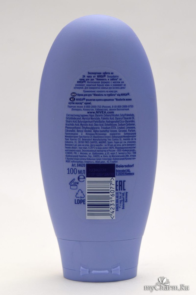 Состав у крем неидеальный, но он и не претендует на натуральные компоненты, однако использовать его советуют в течение 12 месяцев после вскрытия. Для меня это удобно, потому как наряду с натуральными косметическими средствами, которые следует использовать быстро-быстро, дабы они не испортились, крем для рук Nivea всегда меня «подождет», а я вернусь к нему снова и снова, чтобы побаловать свои ручки приятной густой консистенцией крема, подобного шелковистому маслу. Мой крем произведен в Испании.