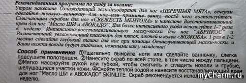 Пакетик-саше с понятным и симпатичным оформлением. Аккуратные ножки мотивируют на уходовые мероприятия, а кусочки льда и листики мяты обещают освежающую прохладу. Это все так приятно и полезно. На обратной стороне есть масса полезных рекомендаций от Skinlite и подробное описание, поясняющее какие средства и в какой последовательности использовать. Также представлены меры предосторожности и состав. Даже бегло просмотрев список ингредиентов, вы будете приятно удивлены «растительным миксом», который позаботится о коже ваших стоп: