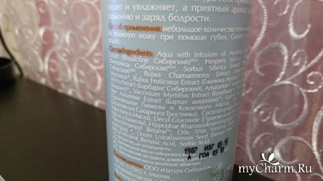 Консистенция средняя, цвет розоватый, перламутровый. Пенится очень мало, но это и плюс этого геля, он плохо пенится, так как в его составе нет СЛС, вредного пенообразователя, который вообще не рекомендуют использовать. Запах приятный, мне, кажется, запах цветочков и свежей травки, такой весенне-летний запах свежести, в меру сладкий, но не приторный. Хотя на флаконе информация, что это ягодный коктейль с нотками сибирских трав. Текстура геля нежная, шелковистая и так приятно им пользоваться. Расходуется очень экономно, несмотря на то, что мало пенится.