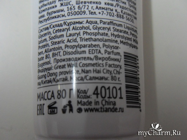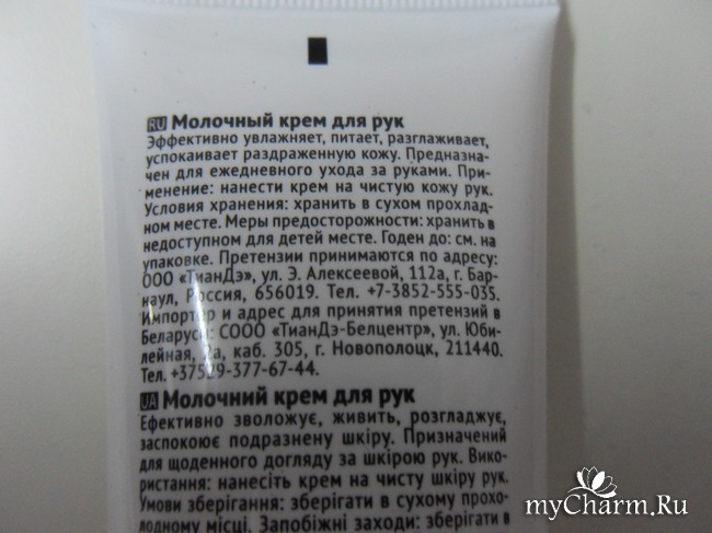 Из минусов можно отметить совсем не идеальный состав продукта. Хотя ТианДе позиционируется как производитель натуральной косметики, в креме очень много химии, в частности метил- и пропилпарабены. Хоть крем и называется «молочный», гидролизат молока находится где-то в середине списка, но не в начале. От этого крем, конечно, не перестает быть хорошим, для меня химия в составе продукции как-то уже привычна, стараюсь не обращать на это внимания. Но тех, кому этот вопрос очень важен, наверно, состав этого крема не порадует.