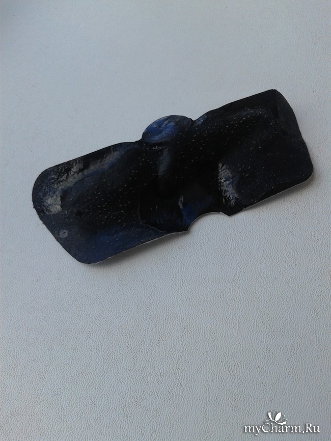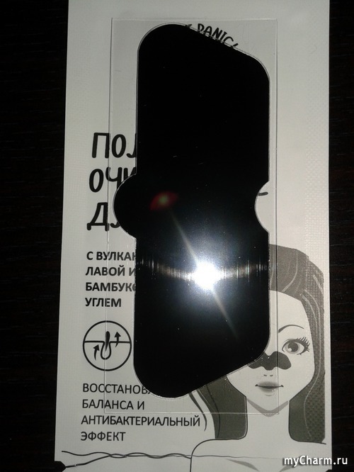 На пакетике с полоской имеются специальные насечки, благодаря которым открыть его не составляет труда. Открыв пакетик, я обнаружила вот такую небольшую полоску, которая с одной стороны черная, глянцевая, а с другой защищена пленкой.