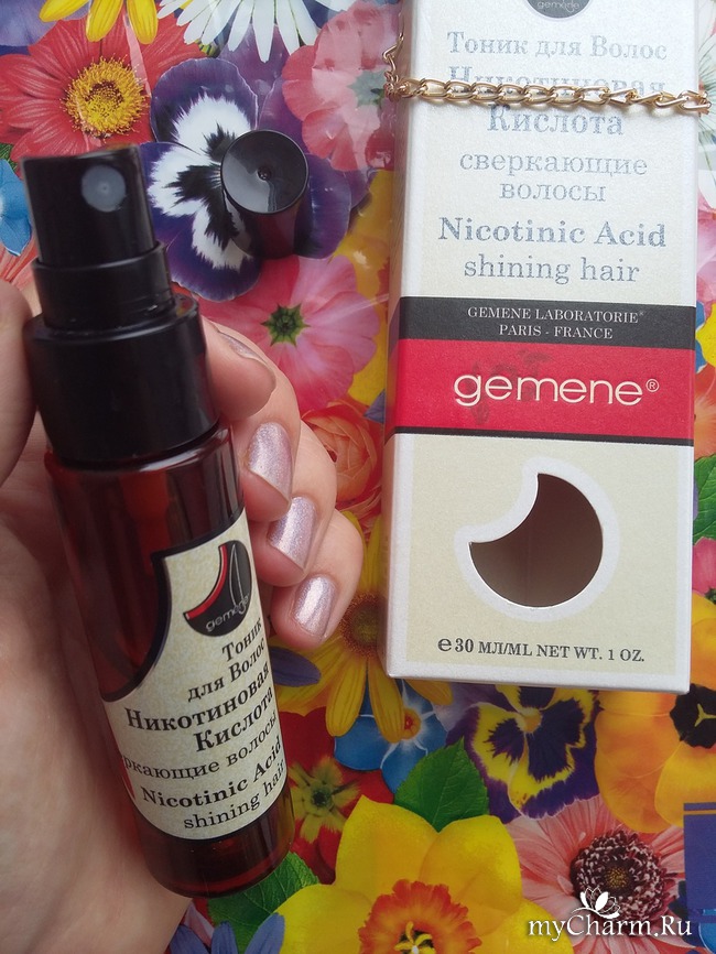 Состав тоника для волос от Gemene - это не только лишь никотиновая кислота, а ещё и гидролат апельсина; экстракты ромашки, алоэ, шалфея; гиалуроновая кислота. Каждый из этих компонентов приносит сплошную пользу как волосам, так и коже головы.