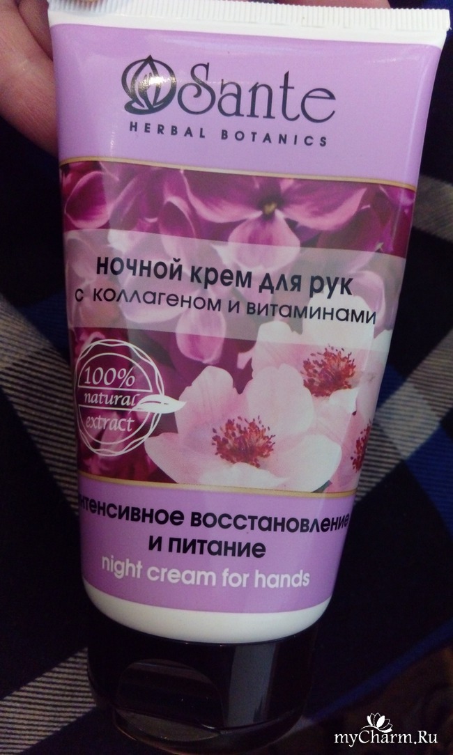 Но есть одно питание, которое на ночь глядя не то чтобы не желательно поглощать, но даже и полезно и необходимо. Речь о ночном креме для рук. Пока мы мирно посапываем в своих кроватках, крем будет работать, интенсивно восстанавливая и питая кожу рук. Да-да-да, именно так мне с полочки «Ашана» пообещал Крем для рук с коллагеном и витаминами от Sante. Вот такая симпатичная сиренево-цветастая этикетка на белом фоне тюбика: