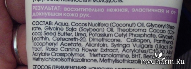 Заявленные в обещании витамины и натуральные компоненты, а именно: Д-пантенол, У, С, В1 и В2 призванные активно замедлять процесс увядания кожи, даря упругость и эластичность. Растительные масла кокоса, какао, сои, экстракт шиповника и сирени вкупе с глицерином, питают кожу, смягчают, успокаивают. Радует, что эти перечисленные компоненты присутствуют в составе ночного крема, причём в первой её половине.