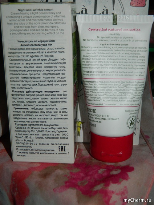 Рекомендую ночной крем от морщин 40+ от NONICARE всем прекрасным дамам, столкнувшимся с возрастными проблемами кожи. Кстати, тот, чей возраст менее сорока лет, тоже может воспользоваться данным средством (не секрет, что морщины могут появиться в более раннем возрасте). Производитель рекомендует женщинам старше 35 лет использовать крем курсами по 28-30 дней, проще говоря, по месяцу. Не стоит беспокоиться, что крем испортится во время между курсами: его срок годности с момента открытия упаковки составляет шесть месяцев.