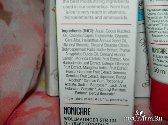 Экстракт граната – один из мощных и действенных антиоксидантов, сок фрукта нони, в котором сконцентрировано множество витаминов, микроэлементов и аминокислот, экстракт ягод асаи, стимулирующий обновление клеток кожи. Увлажняющий алоэ, смягчающий и дарящий упругость манго, усиливающий синтез коллагена и эластина в коже экстракт семян пальмы. Витамины С и Е, сквалан (отличный увлажнитель) и целый набор масел: ши, миндаля, кокоса, подсолнечника…