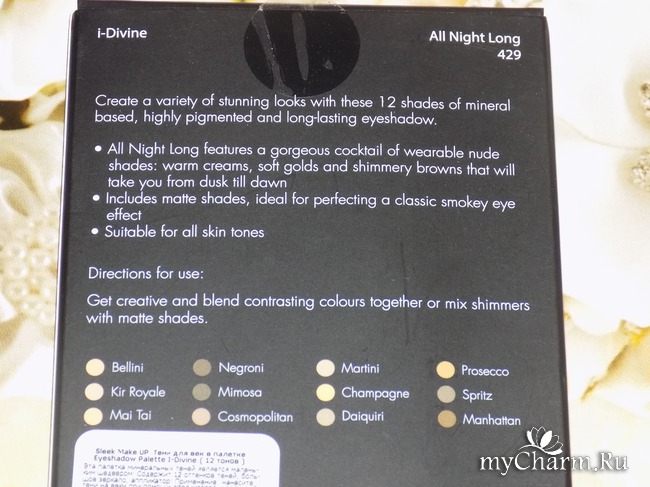 Цена палетки в интернет-магазинах - 1094 рублей. Нужно заметить, что существуют отдельные палетки i-Divine для нанесения дневного макияжа и вечернего. Я пробую в данном обзоре именно «ночной» вариант. Хотя тот, кто не в курсе, что есть еще «дневная» палетка, получит и в «ночном» варианте удобные для дневного освещения оттенки теней.