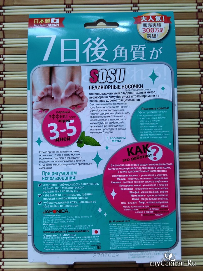 На применение таких носочков впервые я решилась около двух лет назад: выбрала на одном сайте в качестве подарка за сделанный заказ. Увы, хоть на упаковке и было упоминание про то, что носочки отшелушивают и обновляют кожу стоп, никакого подобного эффекта за ними я не заметила. Наверное, поэтому в действие средства для пилинга SOSU я не верила до последнего, хоть и читала восторженные отзывы на него в просторах интернета. Первые несколько дней после получения посылки от сайта Japonica я просто поглядывала на эти педикюрные носочки и решала – рискнуть или нет. Любопытство взяло верх, конечно же. Не мог не впечатлить факт, что только в России таких носочков продано целых 1,4 млн. пар! Внимательно изучив описание средства и содержимое коробочки, я приступила к делу.