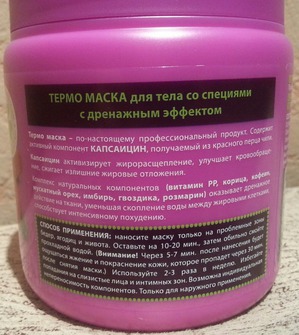Основное активное вещество, благодаря которому и запускаются процессы жиросжигания в клетках — капсаицин, содержащийся в остром перце чили, именно из-за него после нанесения маски хочется усесться в сугроб. Вообще капсаицину приписываются сейчас чуть ли не магические свойства, вплоть до уничтожения раковых клеток. Так это и нет, пусть разбираются ученые, но это на самом деле компонент, который в значительной степени помогает бороться с целлюлитом.