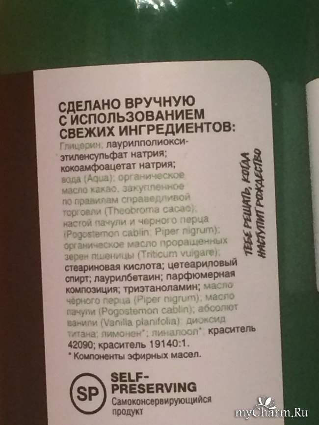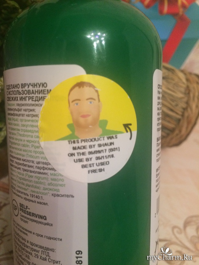 У меня вот такая увесистая бутылочка с невероятно ярким крем-гелем. А название просто прелесть "Повелитель рождества". Когда я смотрю на этот яркий зеленый цвет, мне уже скорее хочется поставить дома елку. Вот так цвет мне поднимает настроение! Удобная крышка легко открывается. Под ней имеется небольшое отверстие-дозатор, которое с точностью дозирует средство. На упаковке имеется несколько наклеек. Это основная этикетка с информацией о средстве и еще одна интересная наклеечка. На ней указан человек, который создал этот продукт, так как вся косметика делается в ручную.
