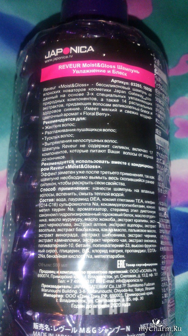На флаконе есть информация на английском языке и японские иероглифы. На задней стороне есть наклейка на русском языке с информацией:адрес сайта, рекомендации, способ применения, полный состав, адрес импортера и телефон для претензий. Срок годности до апреля 2020 года. Объем 500 мл.