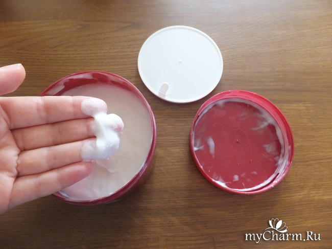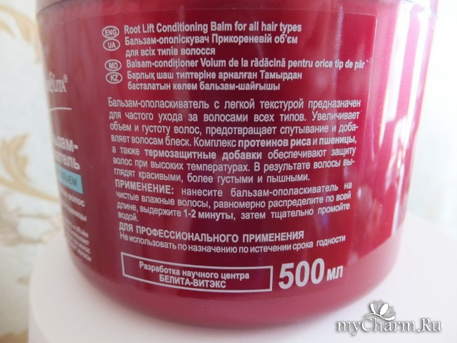 Как и другие средства из этой профессиональной серии, этот бальзам-ополаскиватель – внушительного объема: 500 мл. Банка круглая, вишневого цвета, с откручивающейся крышкой и защитной пластинкой внутри. Выглядит вполне себе презентабельно. Цена вопроса - 3 доллара (в Беларуси).