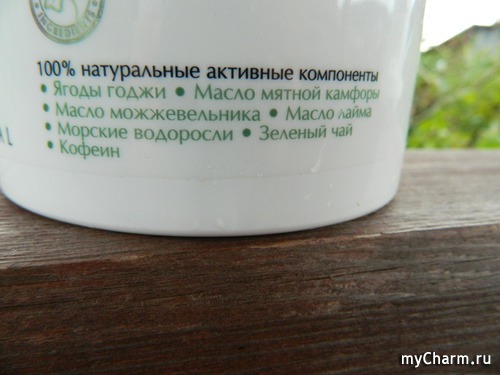 Теперь перейдём непосредственно к обёртыванию. Оно представляет собой гелеобразное вещество с ярко выраженным можжевеловым ароматом (напоминает бальзам «Звёздочка»). Цвет желтовато-коричневый, «болотный». Когда берёшь в руки, ощущаешь маслянистость.