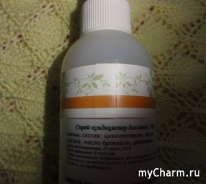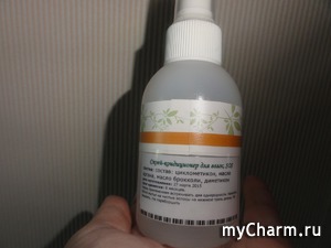 Средство прозрачное, заключено в небольшой прозрачный флакон, который оснащен пульверизатором. По ободку флакона проходит этикетка с логотипом бренда, а сбоку состав и способ применения.Состав кондиционера и мои ощущения
