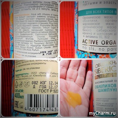 Шампунь достаточно густой, ярко-желтого цвета с насыщенным запахом облепихи. Шампунь содержит в составе приличное количество экстрактов растений: калины, тысячелистника, лиственницы, клевера и замечательные масла: облепихи, арганы, семян льна, шиповника, кроме этого витамины В 1 и В 12. Парабенов и SLS в составе шампуня нет.