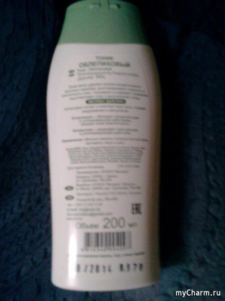 Средство облачено во флакон белого цвета с откидной крышкой мутного зеленого оттенка. Сразу скажу, что крышка мне не понравилась, закрывается не плотно, поэтому взять с собой, например, в дорогу опасно: тоник может легко пролиться.Дизайн флакона не оригинальный: на лицевой стороне упаковки изображена облепиха, указано название и назначение продукта, на обратной - описание, способ применения и состав.