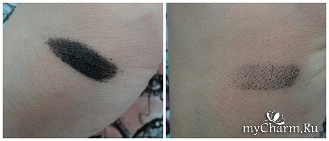 cправа нанесенная водостойкая тушь, а слева результат после проведения ватным диском, смоченным тоником, с нажимом.