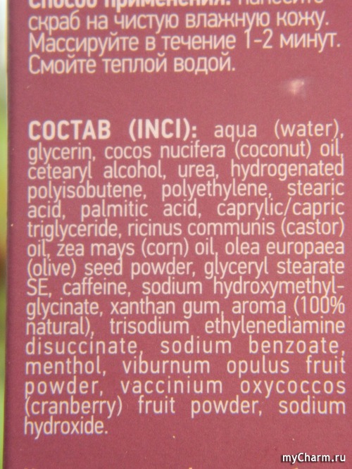 Что же он содержит? Дроблёные косточки оливы – то, что нужно для деликатного удаления омертвевших клеток, ягоды калины и клюквы – они помогают коже заживить мелкие трещинки и ранки, убирают отёки и обладают противовоспалительным действием. Ещё здесь есть кокосовое и кукурузное масла, аминокислоты, кофеин и ментол – всё, что нужно для бережного очищения.